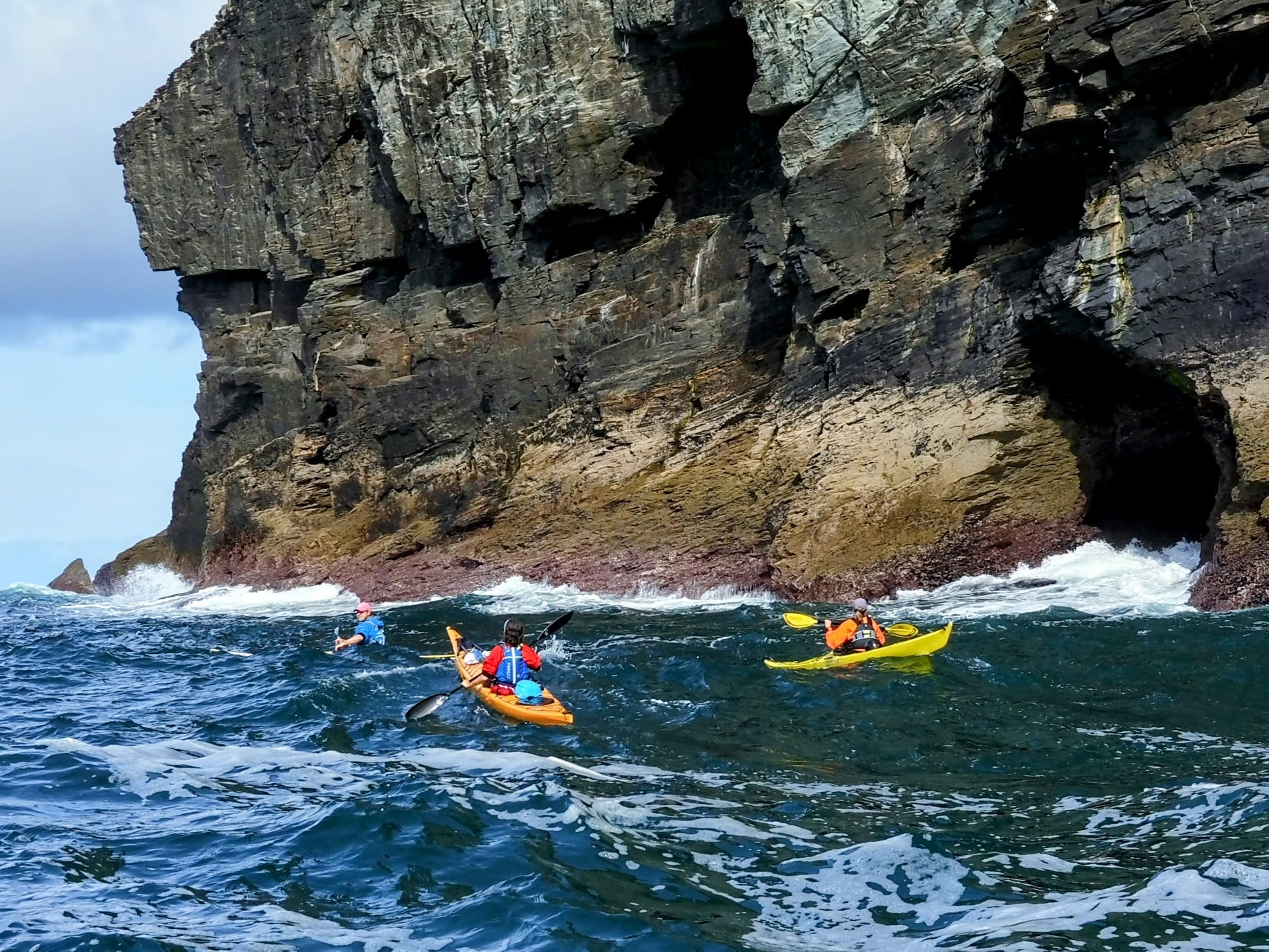 If the wind is strong, it often makes sense to seek coastlines that are sheltered from the wind. However, the wind on these coastlines will blow offshore, creating a potential hazard. What seems like a light wind close to land and cliffs may be a strong wind further out. If the group gets blown away from land, getting back to shore may be difficult.