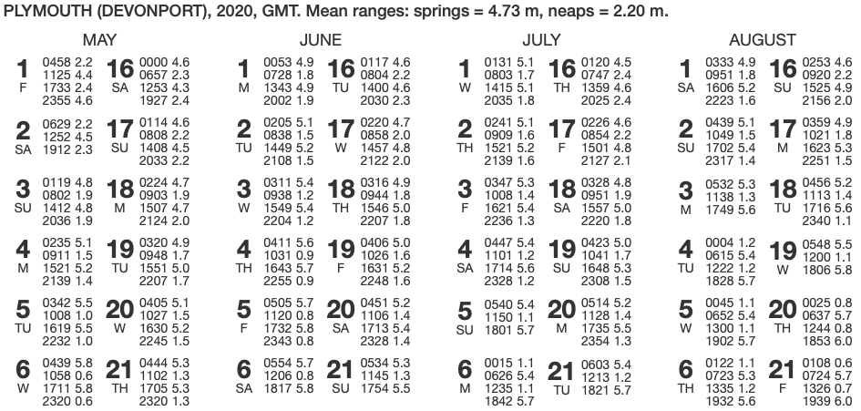 We begin by consulting a tide table to find high water times for Plymouth, being careful to account for British Summer time: