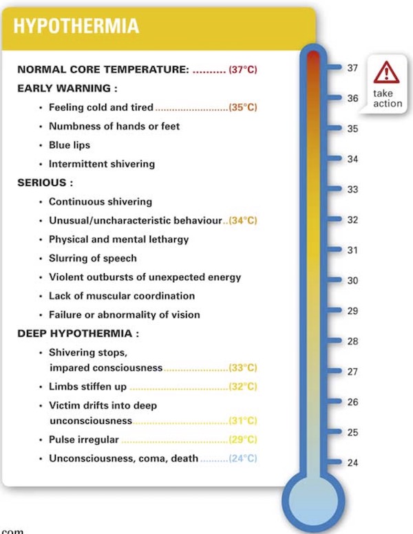 Hypothermia is a condition brought about by the lowering of the body’s core temperature. It can badly affect judgement and be very dangerous. The diagram below shows typical symptoms against core body temperature.
