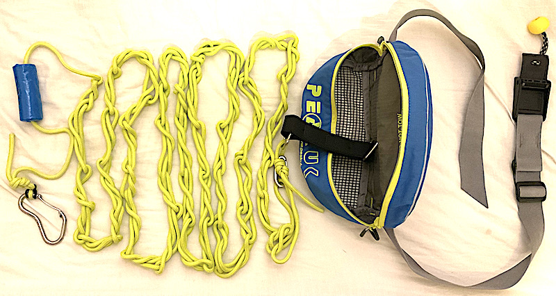The line is kept inside a zipped bag when not in use. The line is attached to the waist strap by a black shock absorber, which stretches to reduce the peak forces transmitted to the paddler’s body. This makes towing more comfortable, especially in waves.